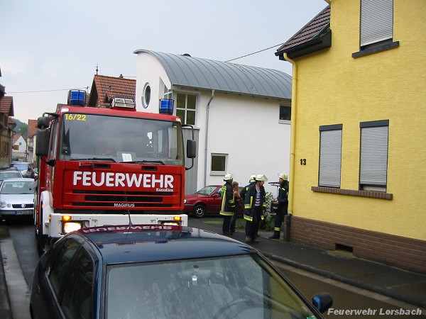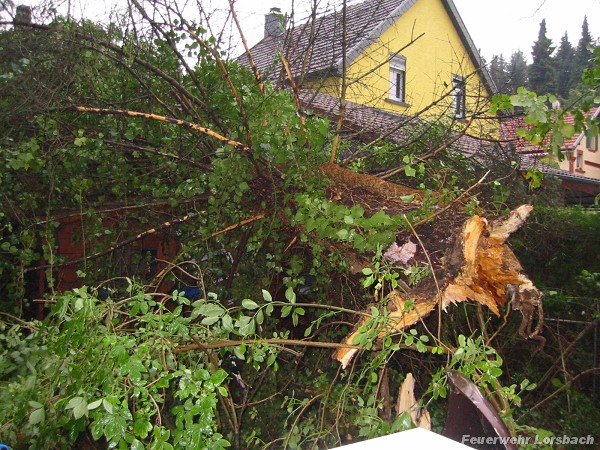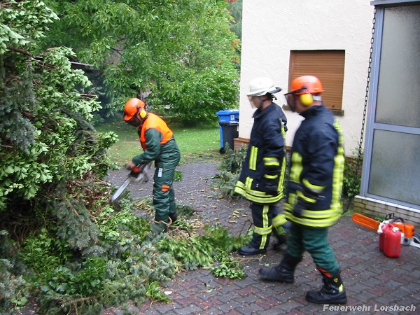 | Einsatzbericht: | Am späten Nachmittag des 27.07.2006 kam es in Lorsbach zu einem unwetterartigen Gewitter in dessen Verlauf zwei Bäume umstürzten, einer davon kam auf einer Stromleitung zu liegen. Zu deren Beseitigung wurde die Feuerwehr alarmiert. Um 17:15 Uhr wurde die Freiwillige Feuerwehr Lorsbach zu einem umgestürzten Baum auf einem Grundstück in der Bornstraße alarmiert. Dieser wurde von der Feuerwehr mit Motorkettensägen zersägt. Noch während des ersten Einsatzes wurde die Feuerwehr zu einer zweiten Einsatzstelle gerufen. |