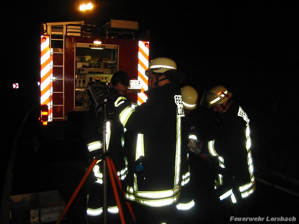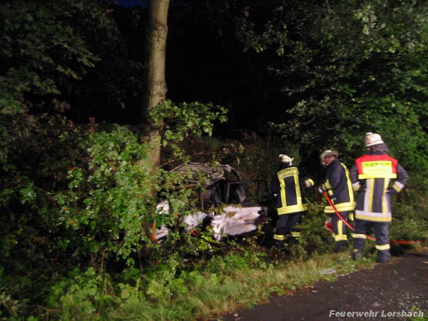 | Einsatzbericht: | Am frühen Sonntagmorgen kam bei einem Verkehrsunfall auf der Landesstraße L 3011 zwischen Lorsbach und Eppstein ein Mensch ums Leben. Von Eppstein kommend kam ein PKW in einer Kurve von der Fahrbahn ab und prallte gegen einen Baum. Dabei fing der PKW Feuer. Die Freiwilligen Feuerwehren aus Lorsbach und Hofheim wurden um 4:10 Uhr zur Einsatzstelle alarmiert. Beim Eintreffen des ersten Löschfahrzeugs stand der PKW schon voll in Brand. Für die Person im PKW kam jede Hilfe zu spät. Das Feuer wurde mit zwei Strahlrohren gelöscht. Nach der Spurensicherung durch die Polizei wurde die Leiche von der Feuerwehr unter Zuhilfenahme von hydraulischen Rettungsgeräten aus dem PKW geborgen. Der Einsatz dauerte bis 7:15 Uhr. Während dieser Zeit war die L 3011 zwischen Lorsbach und Eppstein voll gesperrt. |