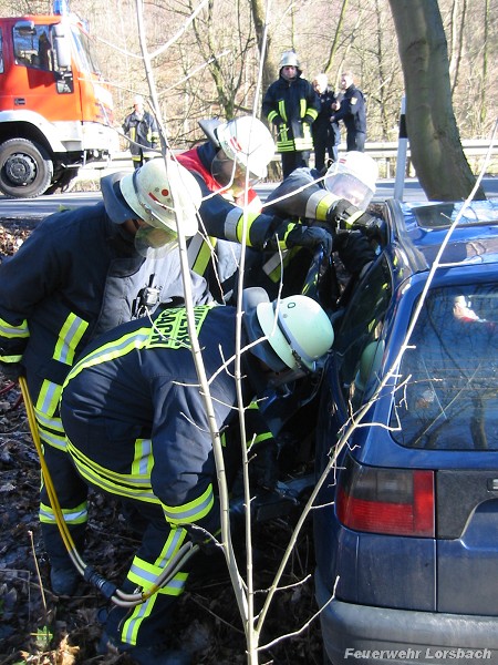 | Einsatzbericht: | Die Feuerwehren aus Lorsbach und Hofheim wurden am 14.02.2009 um 13:33 Uhr über Funkalarmempfänger zur Hilfeleistung bei einem Verkehsrunfall alarmiert. Die Einsatzstelle befand sich auf der Landesstraße L 3011 zwischen Lorsbach und Hofheim. Eine junge Frau war mit ihrem PKW von der Straße abgekommen und gegen einen Baum geprallt. Da sich die Fahrertür durch den Unfallschaden nicht mehr öffnen ließ, musste diese mit einem hydraulischen Rettungsgerät durch die Feuerwehr geöffnet werden. Nach der ärztlichen Erstversorgung wurde die Frau durch den Rettungsdienst in das Krankenhaus gebracht. Während der Rettungsarbeiten war die L 3011 im betroffenen Bereich vollständig gesperrt. |