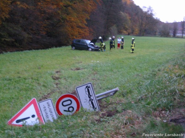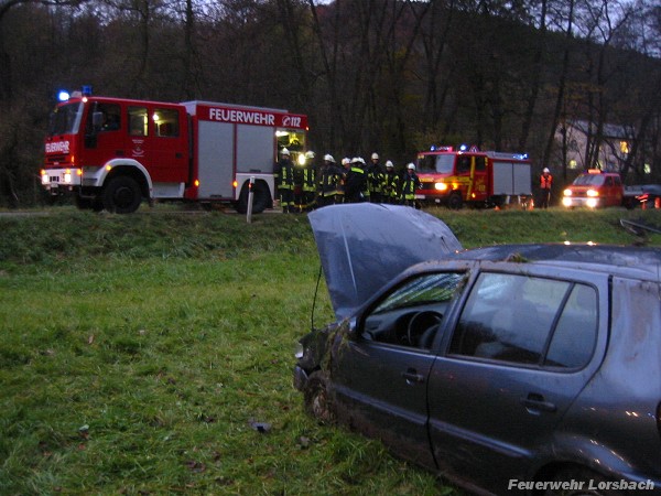 | Einsatzbericht: | Am Dienstag den 03.11.2009 um 16:35 Uhr wurden die Freiwilligen Feuerwehren aus Lorsbach und Hofheim zu einem Verkehrsunfall auf der L3011 zwischen Lorsbach und Hofheim alarmiert. Kurz nach der Ortsausfahrt von Lorsbach war ein PKW mit zwei Insassen auf gerader Strecke von der Fahrbahn abgekommen, hatte sich mehrfach überschlagen und war auf einer Wiese neben der Straße zum Stehen gekommen. Entgegen erster Meldungen waren die beiden Insassen nicht im Fahrzeug eingeklemmt. Beide wurden jedoch verletzt und nach der Erstversorgung vom Rettungsdienst zur weiteren Behandlung in ein Krankenhaus gebracht. Die Aufgabe der Feuerwehr beschränkte sich auf die Sicherung der Einsatzstelle und des Fahrzeugs. |