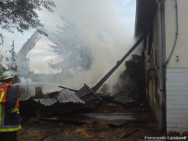 | Einsatzbericht: | Die Feuerwehr Lorsbach wurde am Freitag, den 6. August, um 12:15 Uhr zum Brand eines Stallgebäudes auf einem Aussiedlerhof in Wallau alarmiert. Der Einsatz lief zu diesem Zeitpunkt bereits seit einer halben Stunde und die Lorsbacher Kräfte wurden zur Unterstützung beim Aufbau einer Wasserversorgung aus dem Gewerbegebiet Wallau und für weitere Atemschutzgeräteträger benötigt. Im Laufe des Einsatzes baute der Lorsbacher Schlauchwagen zusammen mit dem Hofheimer Wechselladerfahrzeug mit aufgeladenem Abrollbehälter Schlauch eine fast zwei Kilometer lange B-Leitung bis zur Brandstelle. Die Tragkraftspritze des Schlauchwagens wurde als Verstärkerpumpe in der Schlauchleitung eingesetzt. In der Zwischenzeit wurde die Abschnittsleitung Wasserversorgung vom Zugführer der Feuerwehr Lorsbach übernommen. Glücklicherweise konnte der Brand bis zum Aufbau der Schlauchleitung mit der vor Ort zur Verfügung stehenden Löschwasserversorgung unter Kontrolle gebracht werden. Die gelegte Schlauchleitung kam nicht mehr zum Einsatz und konnte kurze Zeit später zurückgebaut werden. Die Atemschutzgeräteträger des Lorsbacher Tanklöschfahrzeugs kamen als Sicherungstrupp für die eingesetzten Angriffstrupps zum Einsatz. |