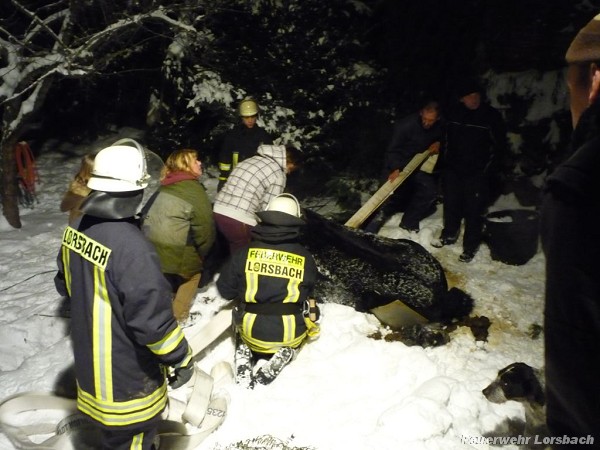 | Einsatzbericht: | Am späten Abend des 17.12.2010 rettete die Freiwillige Feuerwehr Lorsbach ein Pferd, das mit einem Bein in die Abdeckung einer Zisterne eingebrochen war. Das Pferd war aus seinem Pferch in einer Hofreite in der Kirchstraße ausgebrochen. Unglücklicherweise lief es auf die Zisterne und brach dort mit einem Hinterbein durch die Abdeckung. Nach dem die Eigentümer die Zwangslage des Pferdes bemerkt hatten, riefen sie die Feuerwehr zu Hilfe. Die Feuerwehr Lorsbach wurde um 19:39 Uhr zur Hilfeleistung alarmiert und war mit 17 Feuerwehrleuten und vier Fahrzeugen im Einsatz. Nachdem ein erster Versuch, das Pferd mit Hilfe von unter ihm durchgezogenen Feuerwehrschläuchen und viel Muskelkraft anzuheben, gescheitert war, kam ein mobiler Kran eines örtlichen Steinmetzbetriebes zu Einsatz. Dieser wurde in Einzelteilen durch einen Hof und eine Scheune getragen und über dem eingebrochenen Pferd aufgebaut. Das Pferd wurde von einem hinzugezogenen Tierarzt betreut und während der Rettung ruhiggestellt. Nachdem der Kran aufgebaut war, konnte das Pferd mit einem Hebegeschirr angehoben und aus seiner misslichen Lage befreit werden. Das Pferd hat sein unfreiwilliges Abenteuer weitgehend unbeschadet überstanden. Der Einsatz dauerte 2,5 Stunden. Besonders erschwert wurde der Einsatz durch die Witterungsbedingungen mit hohem Schnee und Minustemperaturen, die das Pferd mit Unterkühlung bedrohten und bei den Einsatzkräften immer wieder zu unfreiwilligen Rutschpartien führten. |