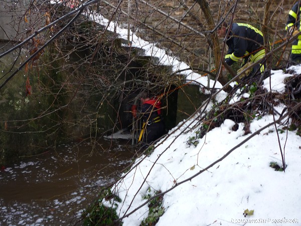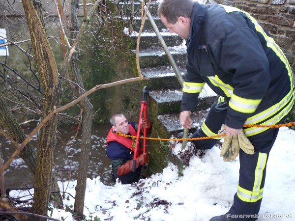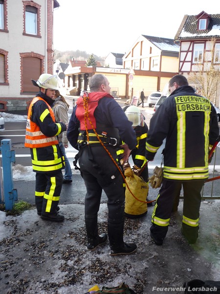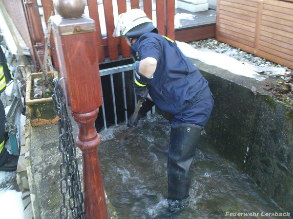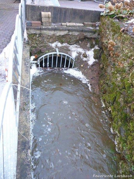 | Einsatzbericht: | Durch die starke Schneeschmelze gab es in Lorsbach an allen Bächen Hochwasser. Im Bachlauf des Hainergrabens verstopften durch Treibgut drei Bacheinlaufgitter und mussten durch die Feuerwehr gereinigt werden. Dazu stiegen Feuerwehrleute in Wathosen in den Bach und entfernten Steine und Äste. An der Mündung des Hainergrabens in den Schwarzbach wurde der Feuerwehrmann mit einer Leine und einer Schwimmweste gesichert. |