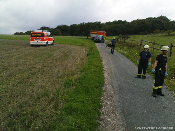 | Einsatzbericht: | Nach dem die Freiwillige Feuerwehr Lorsbach am Samstag den 13. August endgültig in ihr neues Feuerwehrhaus Im Lorsbachtal 13 umgezogen war, wurde sie unmittelbar im Anschluss daran zu einem Einsatz alarmiert, bei dem ein Radfahrer aus dem Wald gerettet werden musste. Am Nachmittag stürzte im Wald zwischen Walterstein und Staufen ein Mountainbikefahrer und verletzte sich dabei schwer. Er konnte aber über sein Handy noch selbst einen Notruf absetzen. Der von der Leitstelle alarmierte Rettungswagen war zwar nach längerer Suche zu dem Verletzten im Wald am Staufen gelangt, hatte sich dann jedoch auf einem schlammigen Waldweg festgefahren. Die daraufhin zur Unterstützung alarmiert Feuerwehr Lorsbach übernahm den Verletzten in einer Schleifkorbtrage auf die Pritsche ihres geländefähigen MTF und fuhr zur nächstgelegenen Straße, wo der Verletzte von einem anderen Rettungswagen übernommen und ins Krankenhaus gebracht wurde. Anschließend wurde der im Wald festgefahrene Rettungswagen befreit. |