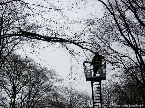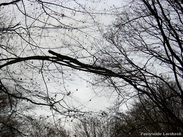 | Einsatzbericht: | Während der Sicherung der Einsatzstelle eines Verkehrsunfalles wurde ein größerer, loser Ast entdeckt, der direkt über der Fahrbahn der Landstraße zwischen Lorsbach und Langenhain auf einem anderen Ast auflag. Der Ast konnte mit der Drehleiter der Feuerwehr Hofheim entfernt werden. |
