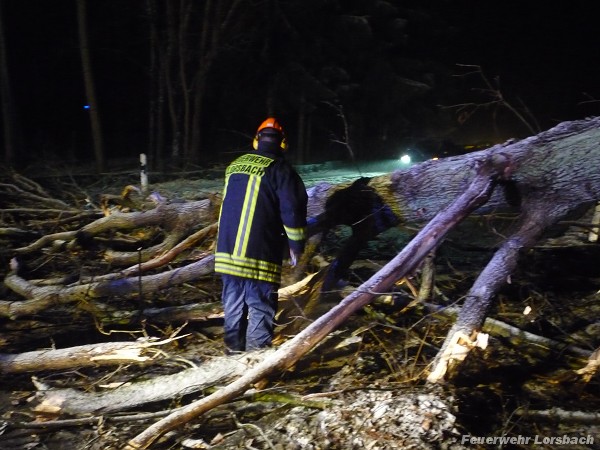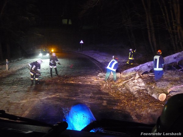 | Einsatzbericht: | Am späten Abend des 20.12. stürzte ein großer Baum auf die L3011 zwischen Lorsbach und Eppstein. Der umgestürtzte Baum blockierte beide Spuren der Straße auf Höhe des Waltersteins. Die Feuerwehr Lorsbach zerkleinerte den Stamm mit zwei Motorkettensägen und räumte die Teile des Baums von der Straße. |