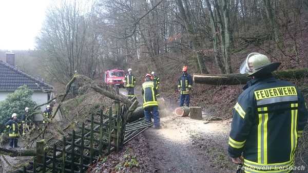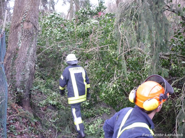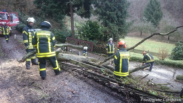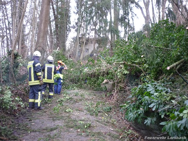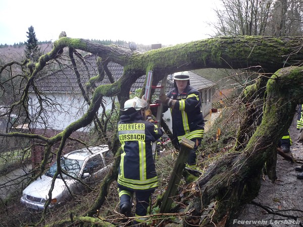 | Einsatzbericht: | Wie schon die vergangenen beiden Jahre begann auch das Jahr 2018 für die Feuerwehr Lorsbach mit mehreren umgestürzten Bäumen. Ausgelöst durch das Sturmtief Burklind und die allgemein aufgeweichten Böden kam es am Mittwoch, den 3. Januar 2018, zu mehreren Einsätzen. Die erste Alarmierung erfolgte um 8:46 Uhr zu einem umgestürzten Baum, der die Straße Am Hasenberg blockierte und beim Fallen einen abgestellten PKW unter sich begraben hatte. Die Feuerwehr Lorsbach konnte das glücklicherweise nur gering beschädigte Fahrzeug freischneiden und aus dem Gefahrenbereich entfernen. Danach konnte der umgestürzte Baum mit zwei Motorkettensägen zerkleinert und die Straße geräumt werden. Dieser Einsatz dauerte 2:44 Stunden. In der Folge wurden Kameraden, die noch mit Aufräumarbeiten im Feuerwehrhaus beschäftigt waren, telefonisch zu zwei weiteren Einsätzen alarmiert: einem umgestüzten Bauzaun und mehreren Ästen auf der L3368 Richtung Langenhain. Um 13:33 Uhr erfolgte eine zweite Alarmierung über Funkalarmempfänger. Erneut war ein Baum auf die Straße Am Hasenberg gestürzt. Die etwa 30 Meter hohe Fichte war längs zur Straße gestüzt und blockierte sie somit auf längerer Strecke. Auch hier wurde die Straße unter Einsatz mehrerer Motorkettensägen frei geräumt. Dieser Einsatz dauerte fast zwei Stunden. |