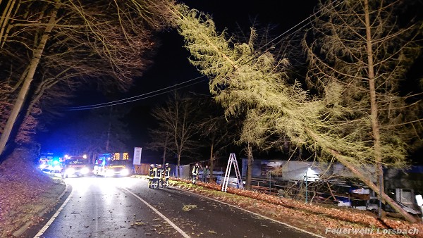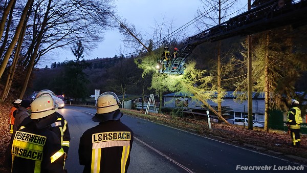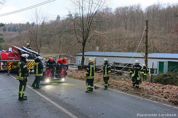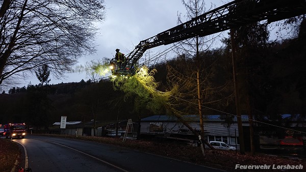 | Einsatzbericht: | Am Sonntagmorgen um 06:42 Uhr wurde die Feuerwehr Lorsbach zu einem umgestürzten Baum an der L3011 Richtung Eppstein alarmiert. Der Baum war in eine Stromleitung gestürzt, die an dieser Stelle die Straße kreuzt und hing nun in dieser. Nach Abschaltung der Stromleitung durch den Energieversorger wurde der Baum aus dem Korb der nachalarmierten Hofheimer Drehleiter von der Stromleitung geschnitten und von der Straße entfernt. Im Nachgang wurde ein weiterer umstürzgefährdeter Baum mit Hilfe der Drehleiter gefällt. Während des Einsatzes war die L3011 voll gesperrt. Der Einsatz dauerte insgesamt etwa 2:30 Stunden. |