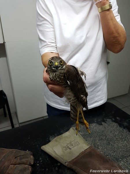 | Einsatzbericht: | Am Samstag, den 27. Juli, wurde die Feuerwehr Lorsbach um etwa Viertel nach Zwölf zu einem verletzten Bussard alarmiert. Eine Anwohnerin hatte das verletzte Jungtier in ihrem Garten gefunden. Die Feuerwehr konnte den, allem Anschein nach erheblich verletzten, Bussard ohne Gegenwehr einfangen und brachte ihn zu einem Tierarzt, der den Vogel aufnahm. Da der Bussard bis nach Oberursel gefahren werden musste, dauerte der Einsatz schließlich eineinhalb Stunden. |