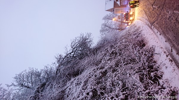 | Einsatzbericht: | Am Donnerstagabend, dem 27. Februar, kam es zu recht heftigen Schneefällen mit einem sehr nassen Schnee. Durch die Schneelast stürzten mehrere Bäume um. Um 17:50 Uhr wurde die Feuerwehr Lorsbach zu einem umgestürzten Baum am Ortsausgang Richtung Eppstein alarmiert. Hier war am Steilhang des Wiegensteins ein Baum oberhalb der Netzsicherung der Felswand umgestürzt und hing nun über der Straße. Heruntergefallende Äste hatten einen PKW beschädigt. Beim Eintreffen sicherte die Feuerwehr den Bereich weiträumig ab. Um den Baum beseitigen zu können, wurde die Drehleiter aus Hofheim alarmiert. In einer zeitaufwändigen Aktion wurden die einzelnen Äste des überhängenden Baums aus dem Korb der Drehleiter mit einer Motorkettensäge geschnitten, auf die gesperrte Straße stürzen gelassen und dort zerkleinert und abtransportiert. Während des Einsatzes der Drehleiter war die L3011 voll gesperrt. |