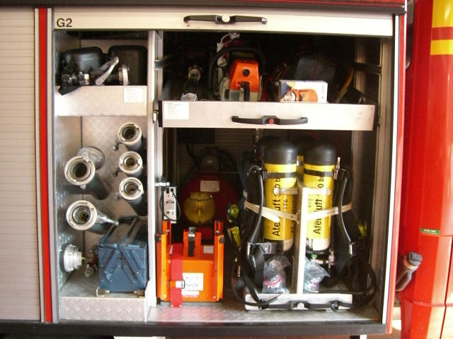 Im Geräteraum 2 befinden sich viele der Gerätschaften für den Löschangriff. So sind in diesem Geräteraum vier Atemschutzgeräte, die dazu passenden Masken sowie die Strahlrohre verladen. Auch eine Reihe von Werkzeugen liegt im ausziebaren Schubfach.