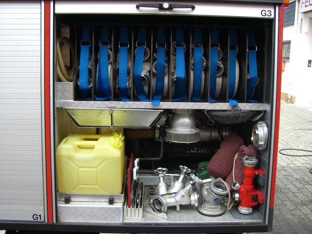 Im Geräteraum 3 sind neben den C-Schläuchen auch viele Armaturen zur Wasserförderung und -fortleitung verladen. Auch das Schaummittel und der dazu gehörende Zumischer Z2R ist hier zu finden.