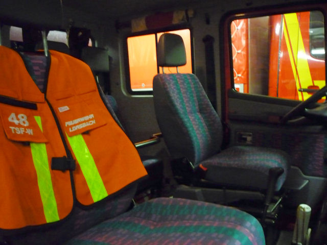 Der Mannschaftsraum des TSF-W. Die orangene Weste dient zur Kennzeichnung des Staffelführers des Fahrzeugs.