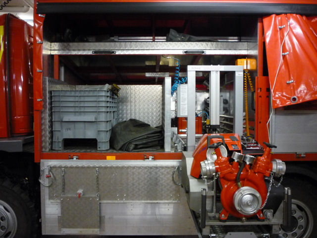 Außerdem befinden sich Feuerlöscher und Erste-Hilfe-Kasten, über die alle Feuerwehrfahrzeuge verfügen, in diesem Fach.