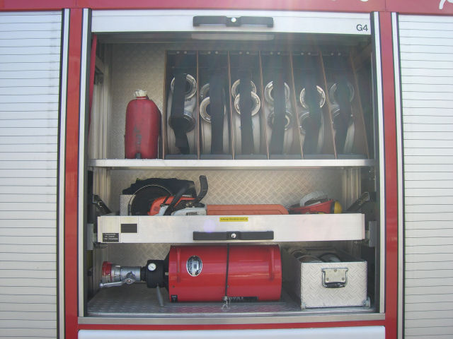 In diesem Geräteraum sind die B-Schläuche und die komplizierteren Werkzeuge wie die Kettensäge verladen.