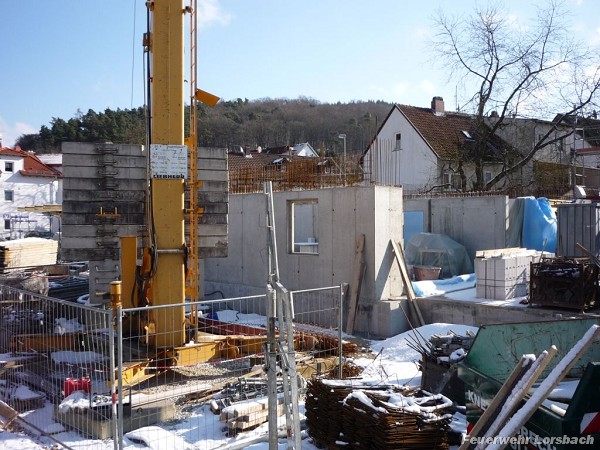 Die Bauarbeiten gehen zügig weiter. Im Erdgeschoss ist die zukünftige Raumeinteilung gut erkennbar und die Vorbereitungen zum Gießen der Geschossdecke werden durchgeführt. Auch das Fundament für den Übungsturm ist schon vorhanden.