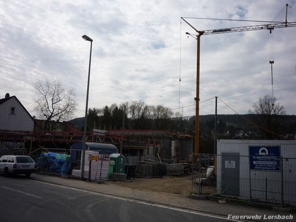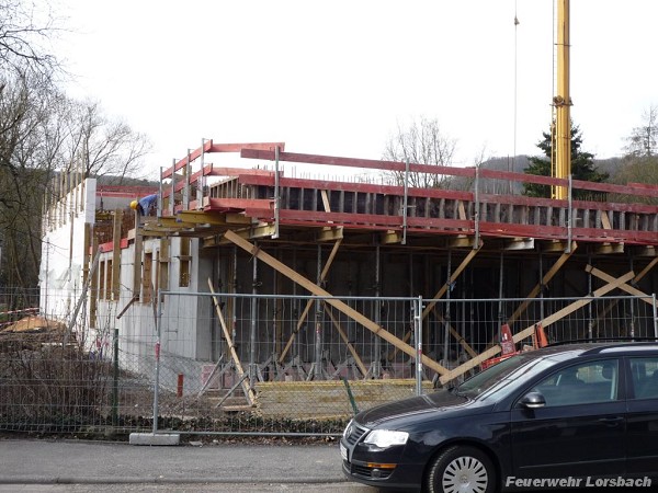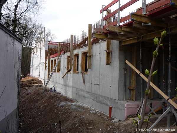 Das Feuerwehrhaus wächst weiter in die Höhe. Es ist schon gut erkennbar, wie weit das Obergeschoss zur Straße hin über das Erdgeschoss hinausragen wird. Die zukünftige Fahrzeughalle im hinteren Gebäudebereich hat schon fast ihre endgültige Höhe erreicht.