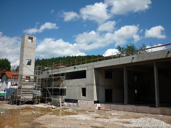 Der Rohbau ist fertig. Der Kran und Teile des Gerüstes wurden abgebaut. Alles ist bereit für die Grundsteinlegung und das Richtfest.