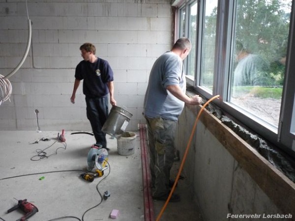 Auch die Feuerwehr Lorsbach selbst beteiligt sich an den Arbeiten, hier beim Setzen der Fensterbänke.
