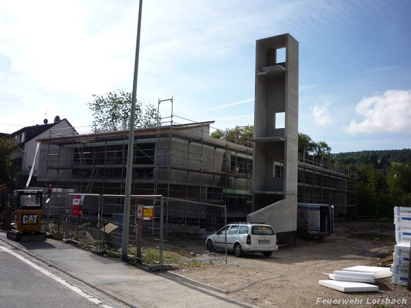 Für die Verputzer und die noch ausstehenden Arbeiten am Flachdach wurde ein Gerüst aufgestellt. Zum Anschluss des Gebäudes an die Versorgungsleitungen musste die Straße halbseitig gesperrt werden.