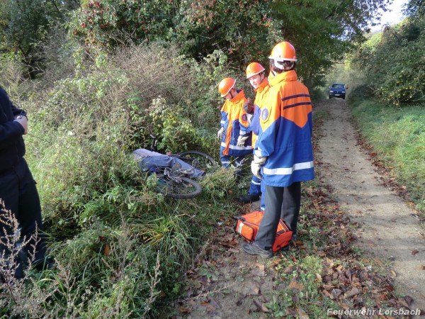 Der erste "Einsatz" folgt bereits nach wenigen Minuten. Ein Radfaher war auf einem Waldweg gestürzt und der Rettungsdienst benötigte Hilfe wegen des schwer zugänglichen Gebietes. Die Jugendfeuerwehr rettete den Radfahrer mit Hilfe der Schleifkorbtrage.