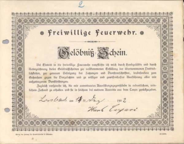 Jeder Feuerwehrmann musste sich durch "Handgelübde" und Unterzeichnung eines Gelöbnisscheines der Feuerwehr verpflichten. Unten ist der Gelöbnisschein von Karl Caspari abgebildet.