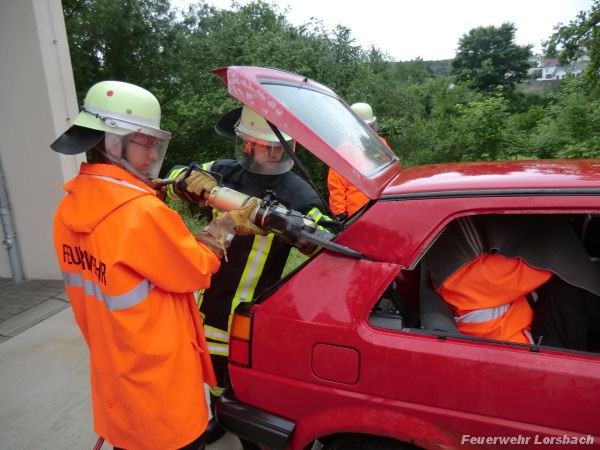 Am 16. Juni übte die Feuerwehr Lorsbach die Rettung von eingeklemmten Personen an Hand von zwei Schrottfahrzeugen, mit denen wir einen Unfall nachstellten. Im Rahmen der Übung wurde ein besonderes Augenmerk auf die patientengerechte Rettung gelegt.