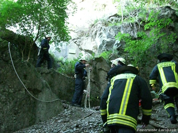 Am 25. August übte die Feuerwehr Lorsbach am Kletterfelsen Lorsbacher Wand am Walterstein. Dieser Einsatzschwerpunkt ist immer wieder Gegenstand von Übungen. Angenommen war ein abgestürzter Kletterer, der von uns mit einer Schleifkorbtrage gerettet werden musste. Nach dem Transport des Verletzten mit einer Menschenkette konnte er nach dem ersten unwegsamen Stück auf unser MTF verladen werden und mit diesem zur Straße und dem angenommenen Standort des Rettungswagens gefahren werden.